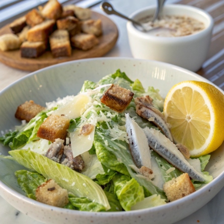 This classic Caesar salad features crisp romaine lettuce, crunchy homemade croutons, and a rich, tangy dressing made from scratch, all topped with generous shavings of Parmesan cheese. It’s perfect as a light lunch, a starter, or a side dish for any meal.