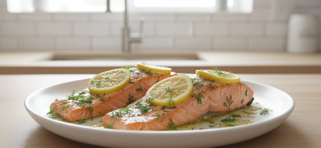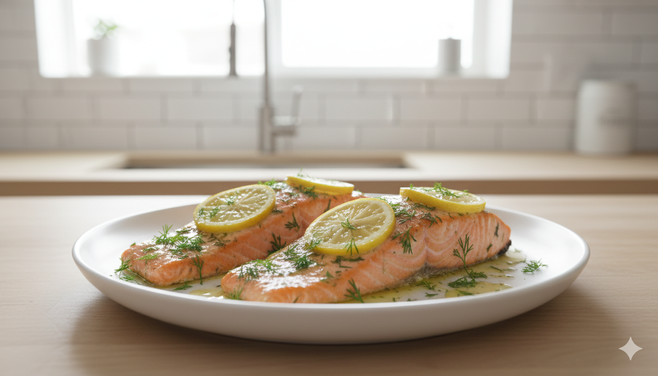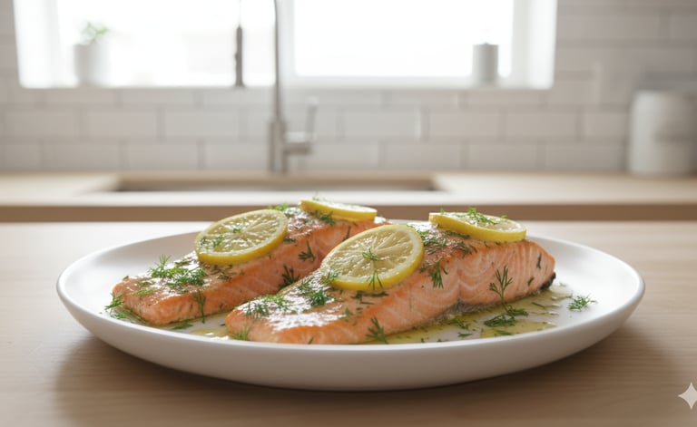Add Lemon Slices (1 minute): Arrange the thin lemon slices directly on top of the buttered salmon fillets.