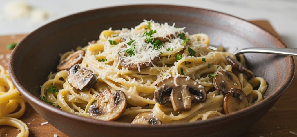 Combine and Finish (2-3 minutes): Add the cooked and drained pasta to the skillet with the creamy mushroom sauce. Stir in the grated Parmesan cheese, chopped fresh parsley, and black pepper. Add ½ cup (120 ml) of the reserved pasta water, stirring well to combine. If the sauce seems too thick, add more pasta water, a tablespoon at a time, until it reaches your desired consistency. Taste and adjust salt as needed.