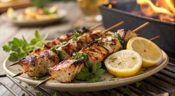 Mediterranean: Greek souvlaki, featuring olive oil, oregano, and lemon.