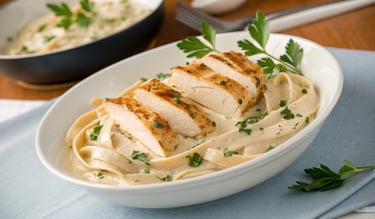 Tender fettuccine coated in a creamy parmesan Alfredo sauce with juicy chicken slices. Rich, satisfying, and irresistibly comforting.