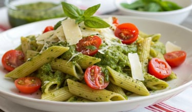 Vibrant penne tossed in fresh basil pesto and sweet cherry tomatoes. Bright, herbaceous, and packed with Mediterranean freshness.