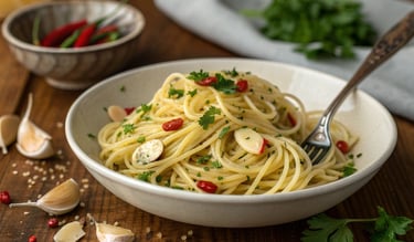 A classic Italian pasta crafted with olive oil, golden garlic slices, chili flakes, and parsley. Light, flavorful, and beautifully minimalist.