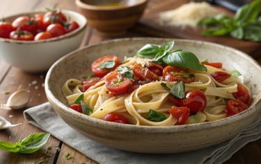 A simple yet aromatic dish featuring juicy tomatoes, fresh basil, and garlic. Light, warm, and bursting with natural flavor.