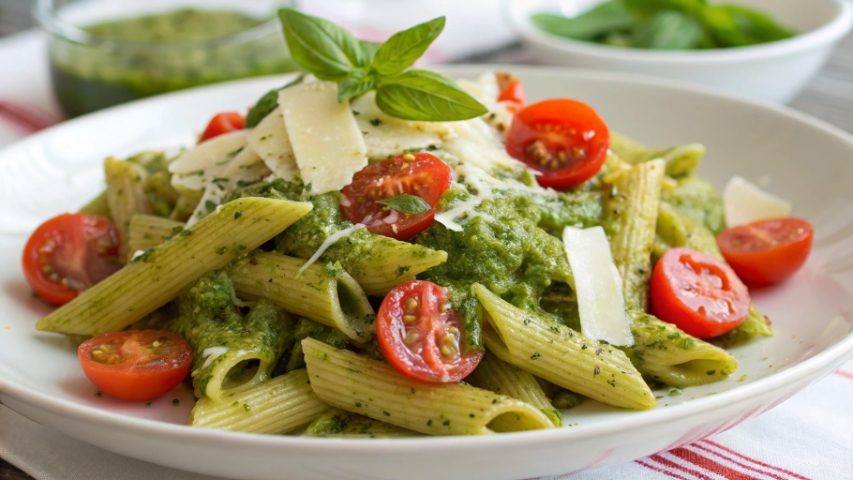 Serve (1 minute): Divide the pesto penne among serving plates. Garnish generously with grated Parmesan cheese. Serve immediately and enjoy!