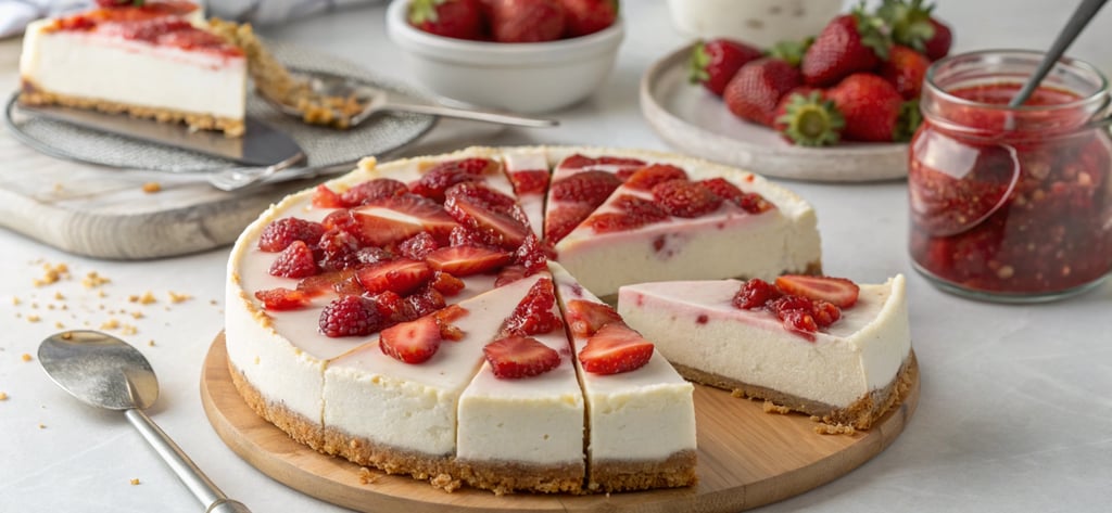 Quick summary: No-bake cheesecake with graham cracker crust, creamy vanilla filling, and fresh strawberry topping.